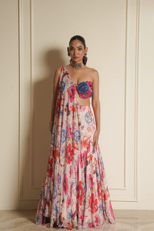 • Pink Chiffon Blouse with Printed Fish Cut Lehenga with Dupatta – Wild flower Wonders
