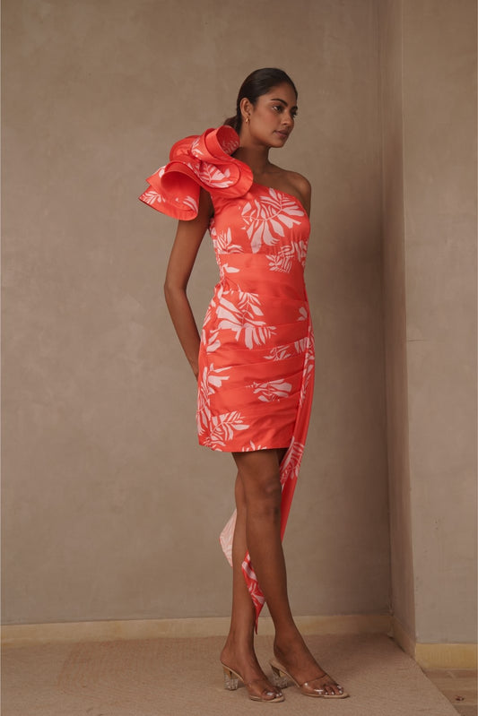 Orange One Shoulder Drape Dress with Dramatic Flower and Trail - Blossom