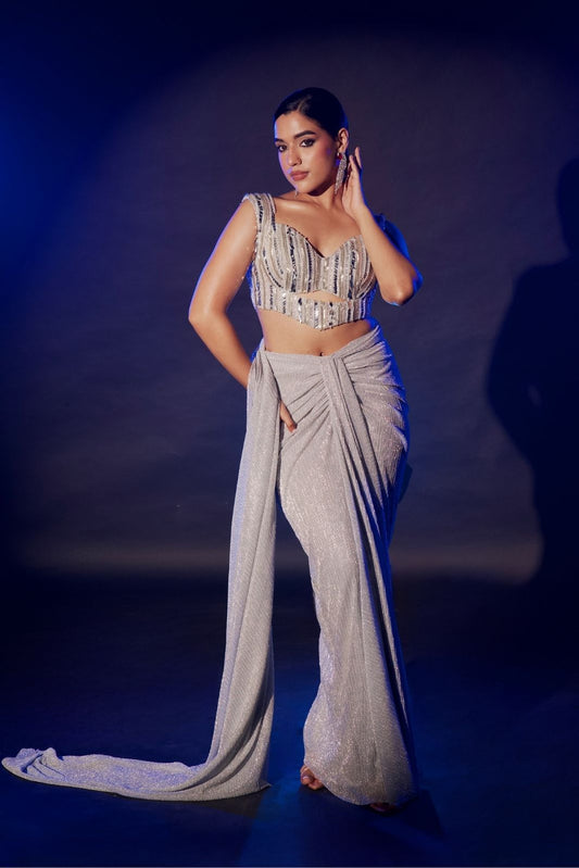 Orange Cream Printed Peplum with Drape Skirt and Choker Dupatta – Cosmos Crush