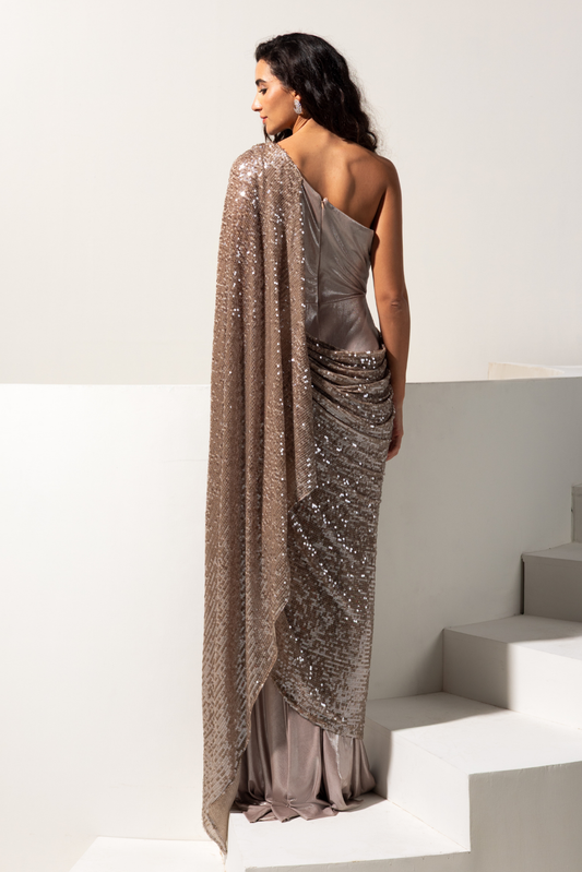 Metallic Brown One Shoulder Drape Saree Gown- Hazel