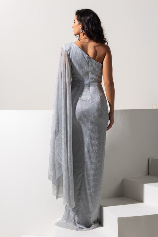 Silver One Shoulder Overlapping Gown with Slit - Lunara