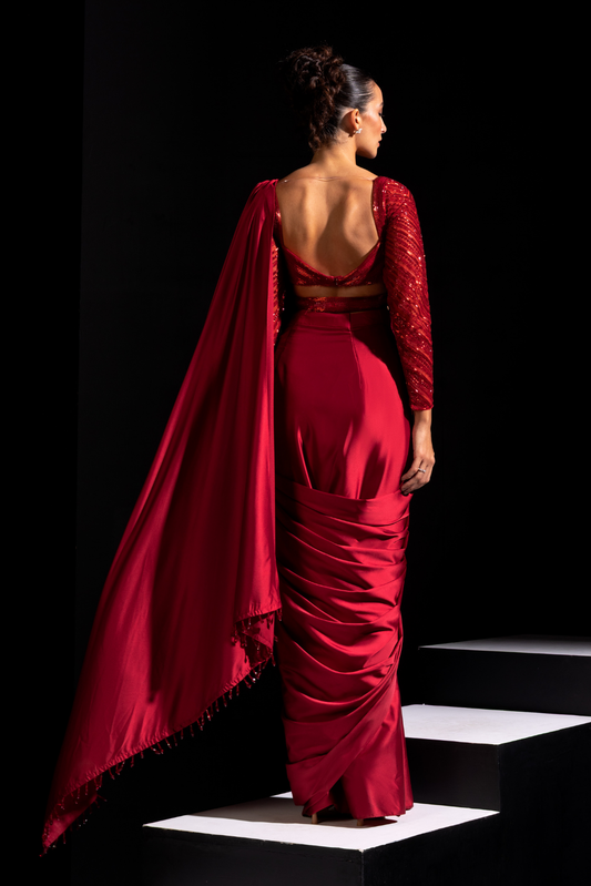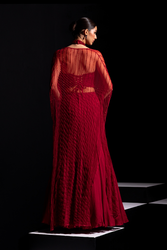 Deep Red Halter Neck Blouse with Fish cut Skirt and Embroidered Cape - Scarlet