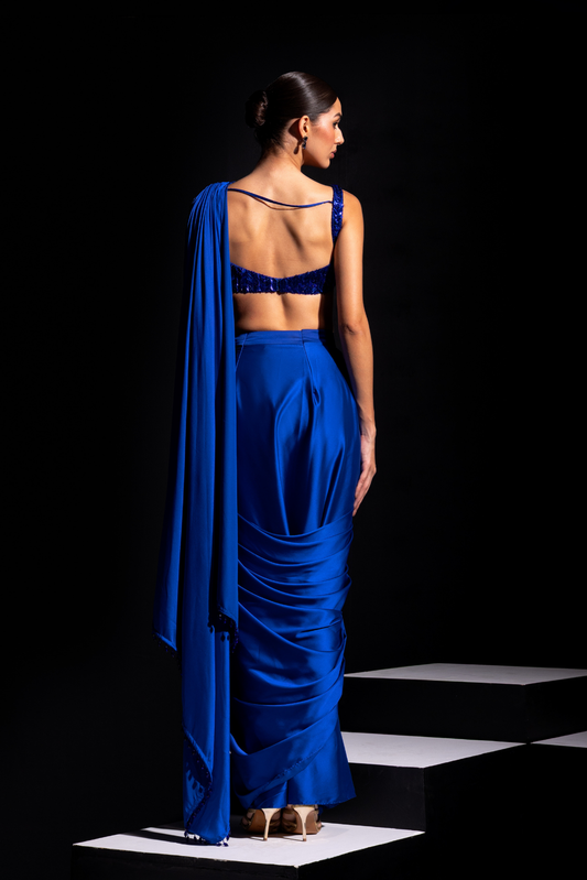 Electric Blue Metallic Embroidery Blouse with Pre draped Saree - Vivid