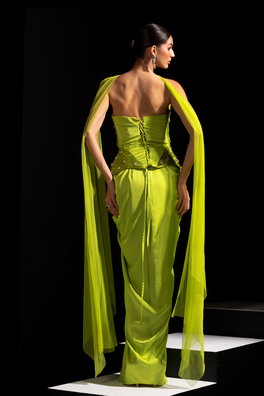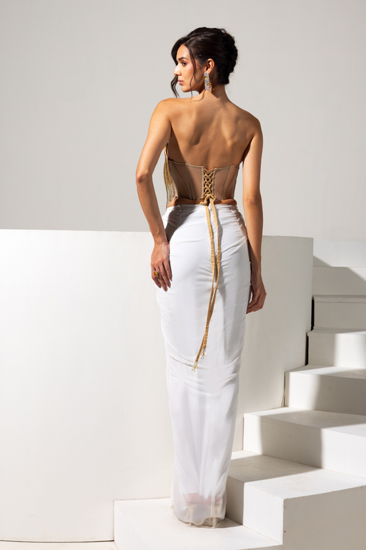 Brown Embroidery Corset with Drape Skirt - Bronza