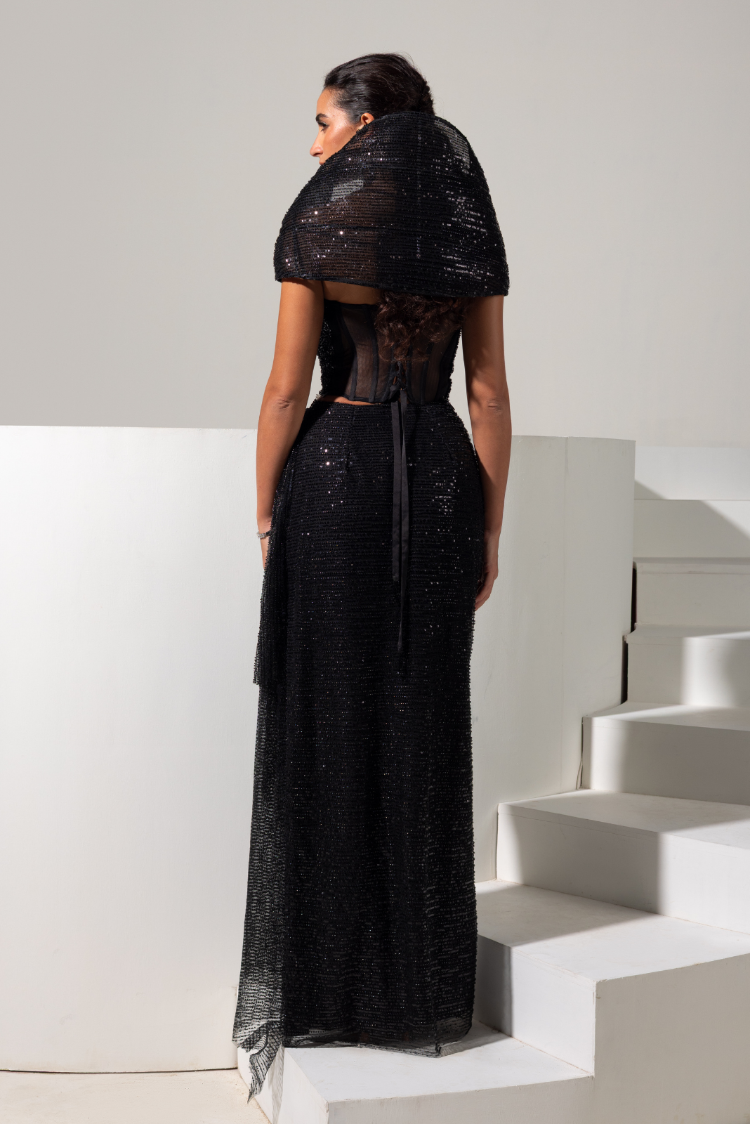 - Black corset with all over embellished skirt with 3d structure on shoulder for that extraordinary look