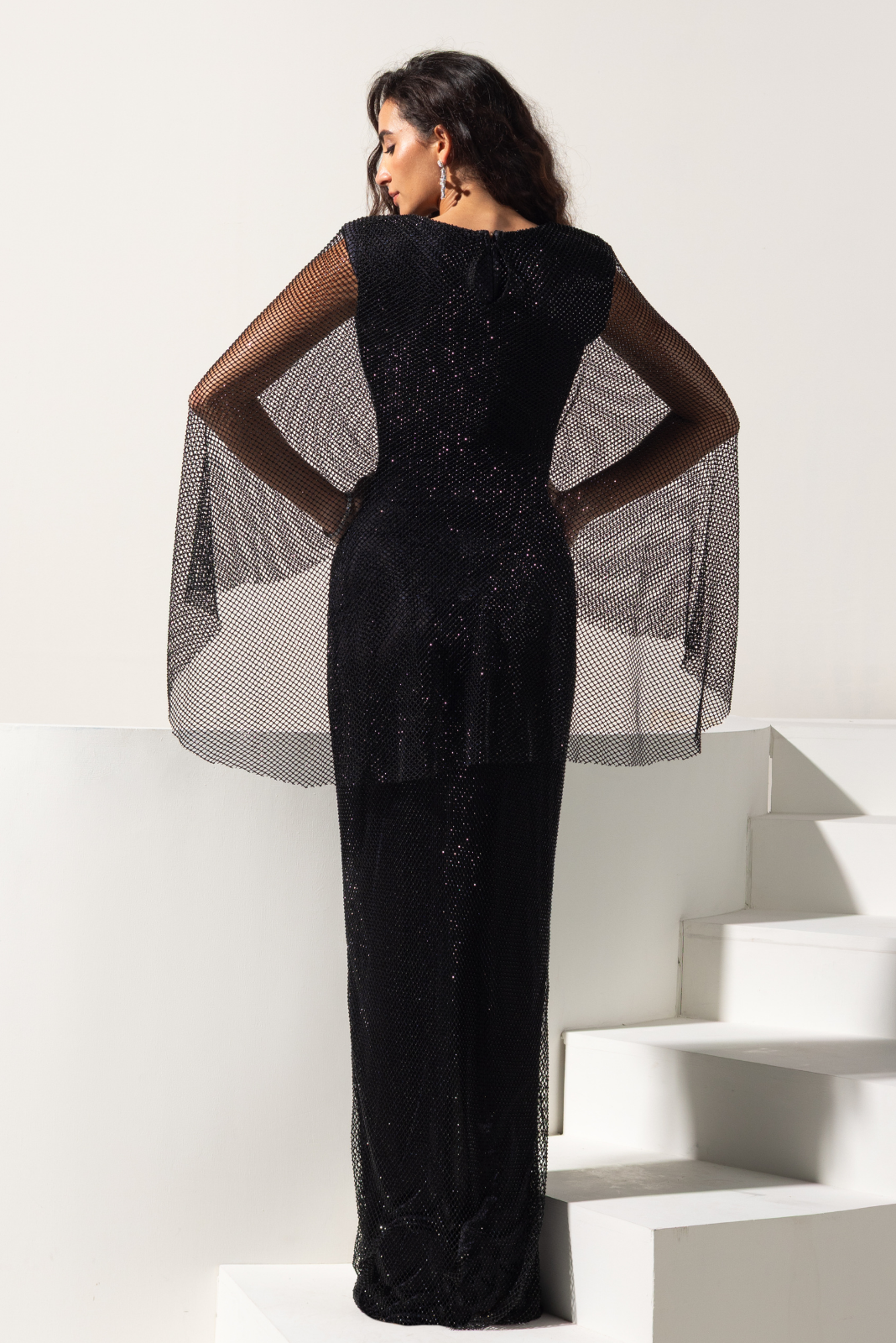 It has beautiful drape on neck converting in cape till the back of gown