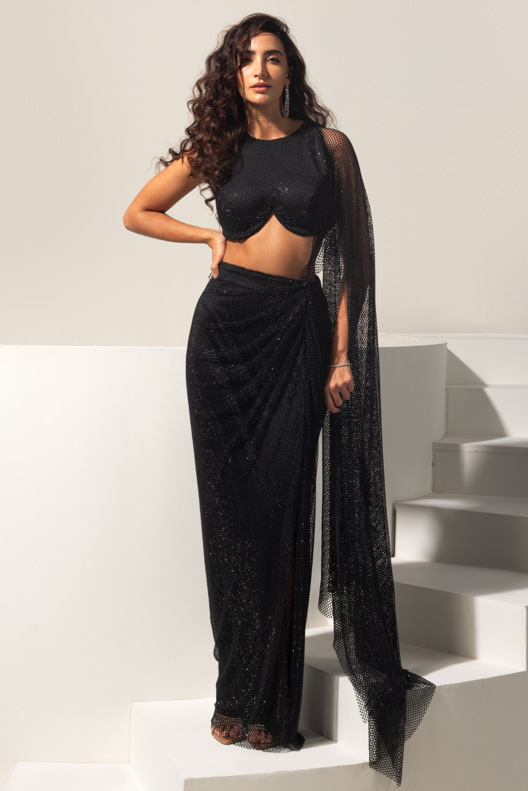 Black Swarovski Pre draped Saree with Blouse - Eclipse