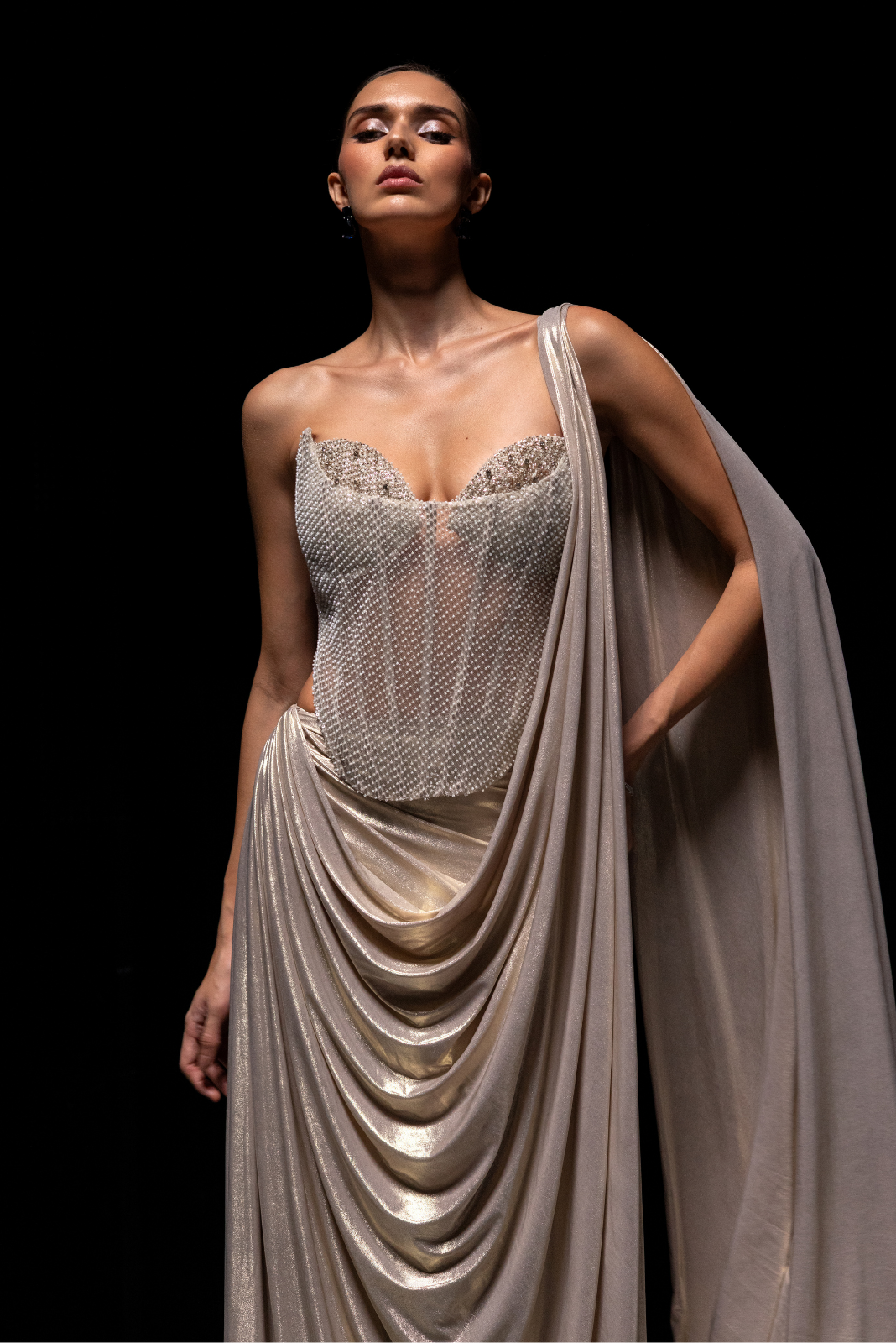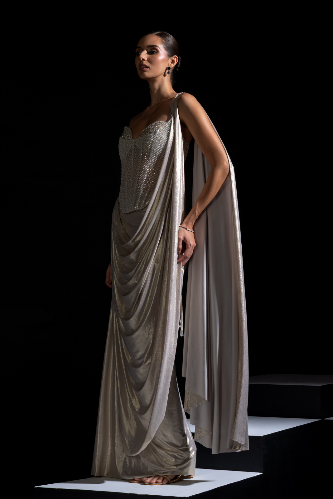 Champagne Embellished Corset with Pre draped Saree - Halo