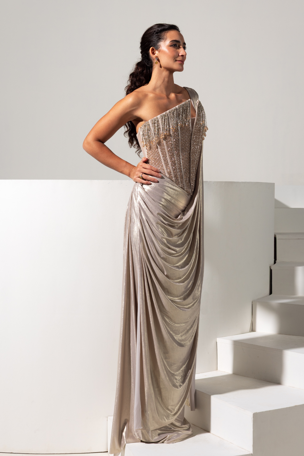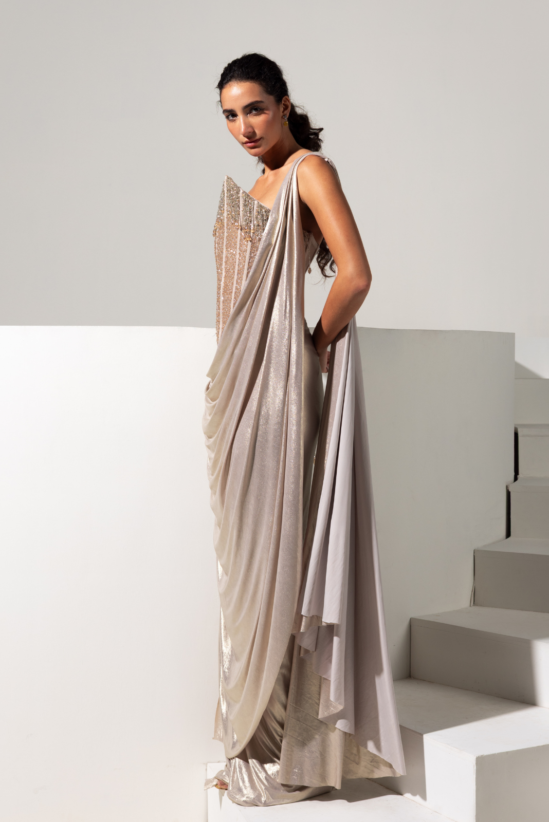 Champagne Full Embroidered Corset with Metallic Drape Saree - Treasure