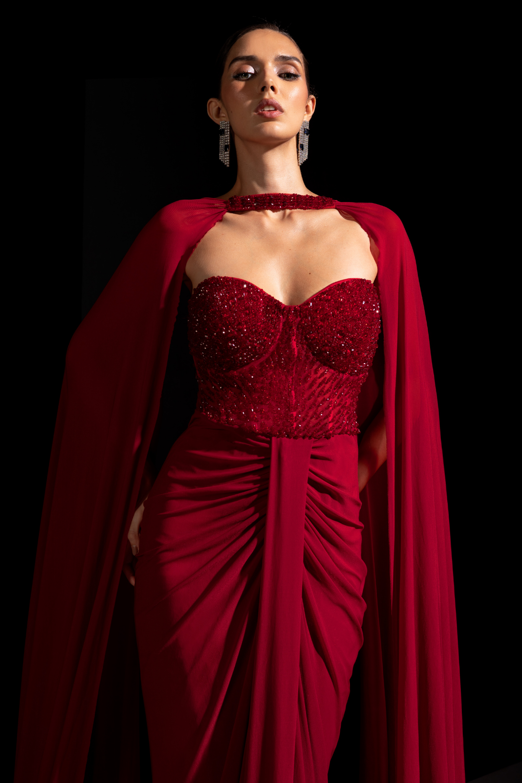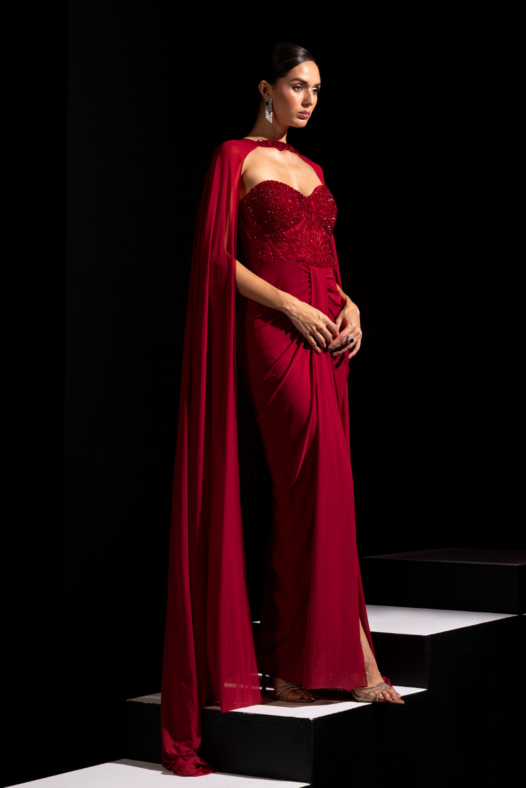 Deep Red Crystal Embellished Gown with Choker - Rouge