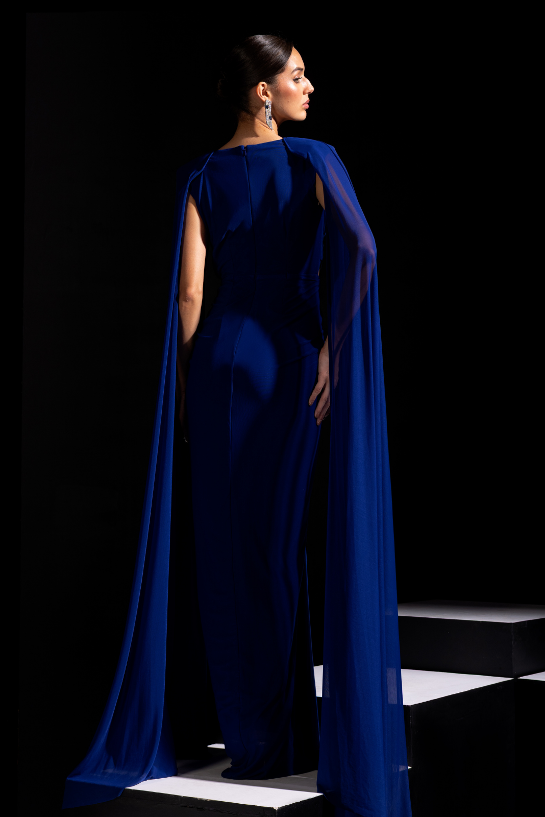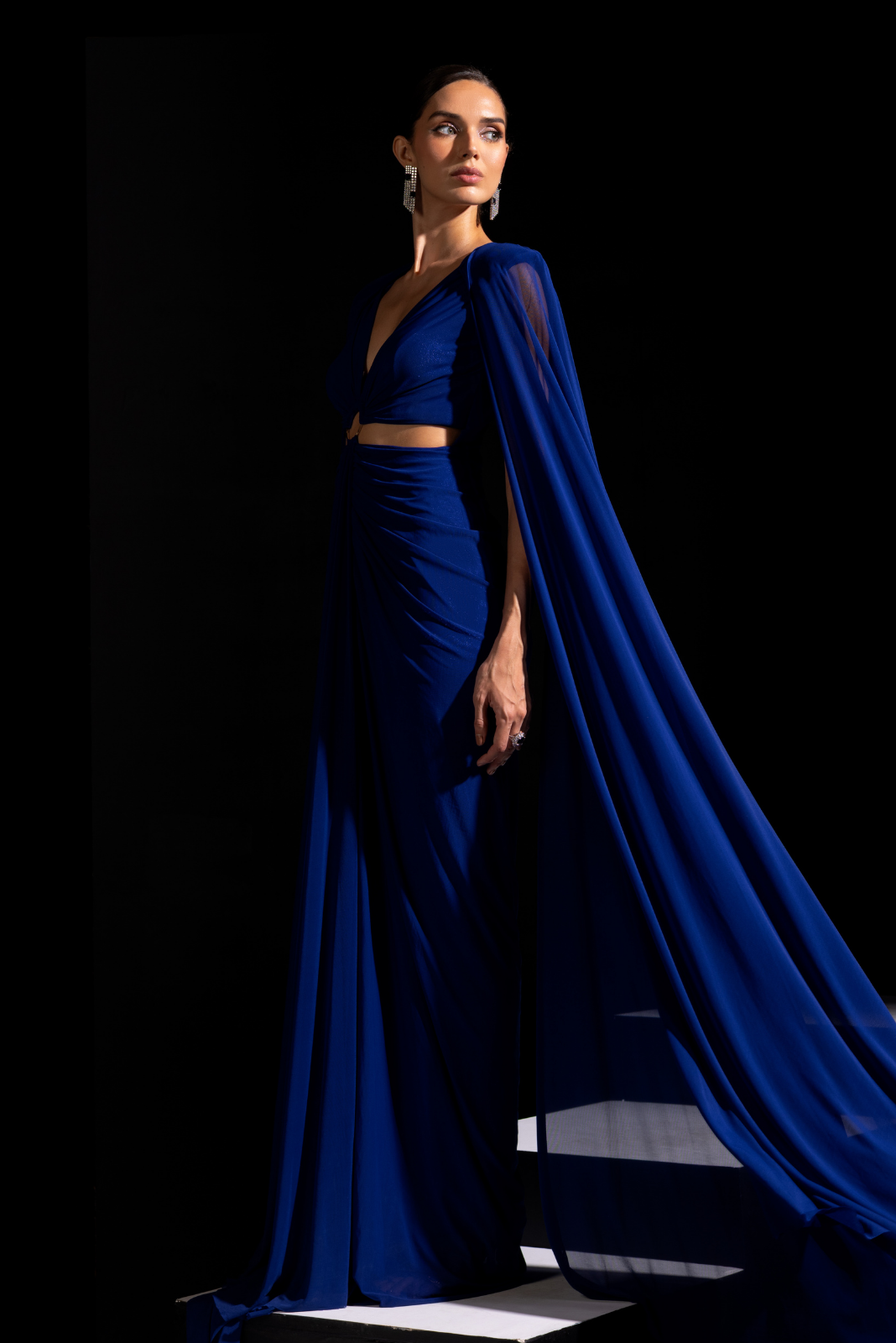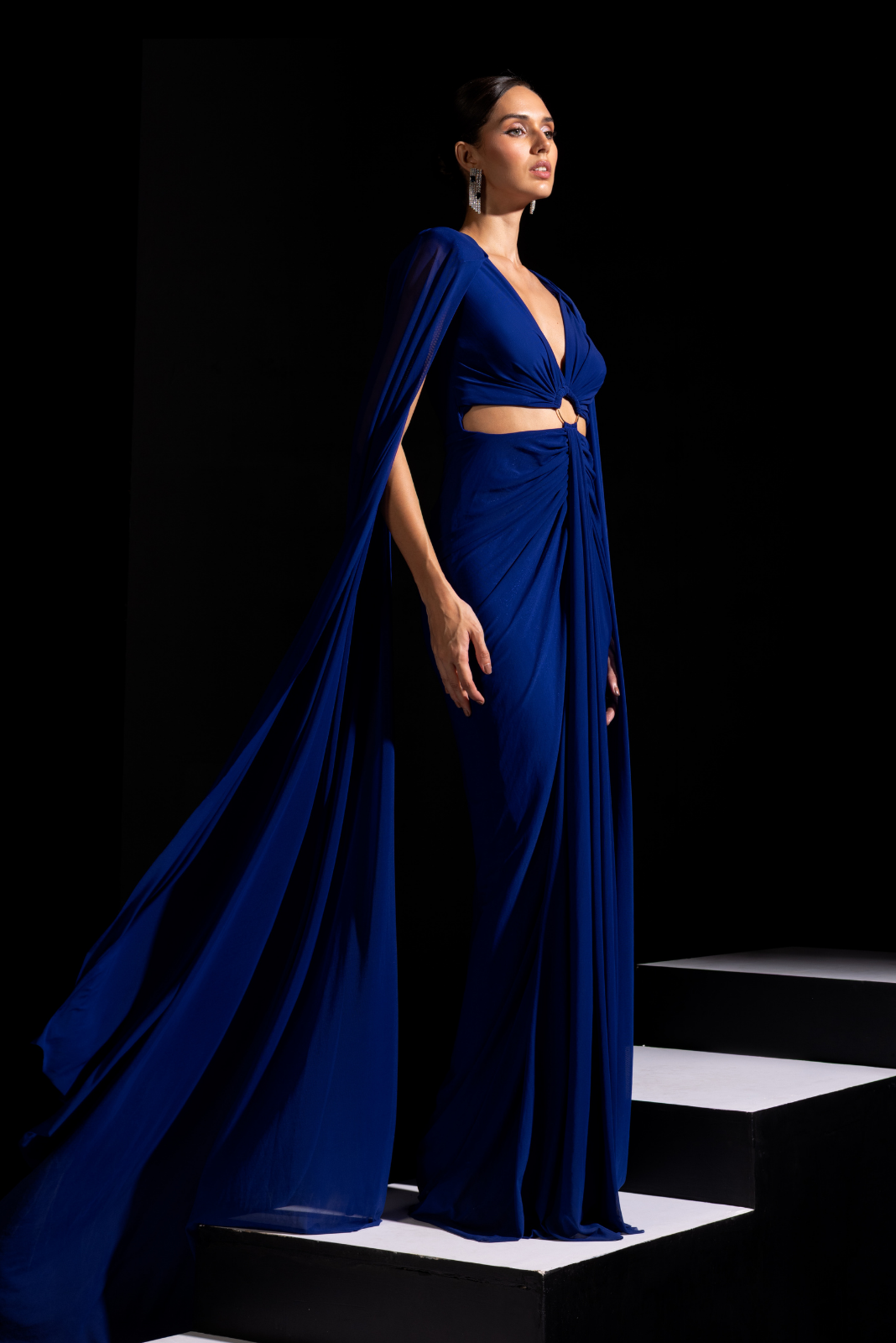 Electric blue cut out gown with long beautiful cape sleeves to complete the look