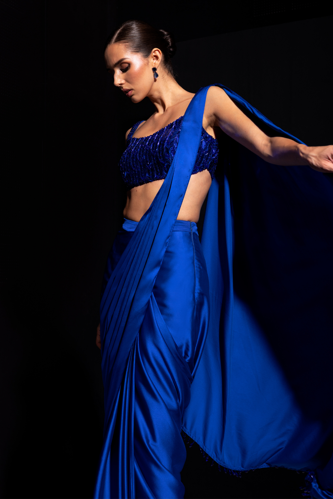 Electric Blue Metallic Embroidery Blouse with Pre draped Saree - Vivid