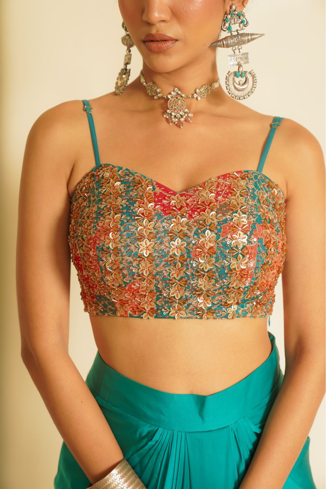 Green Printed Blouse with Drape Skirt and Jacket – Beautiful Bloom