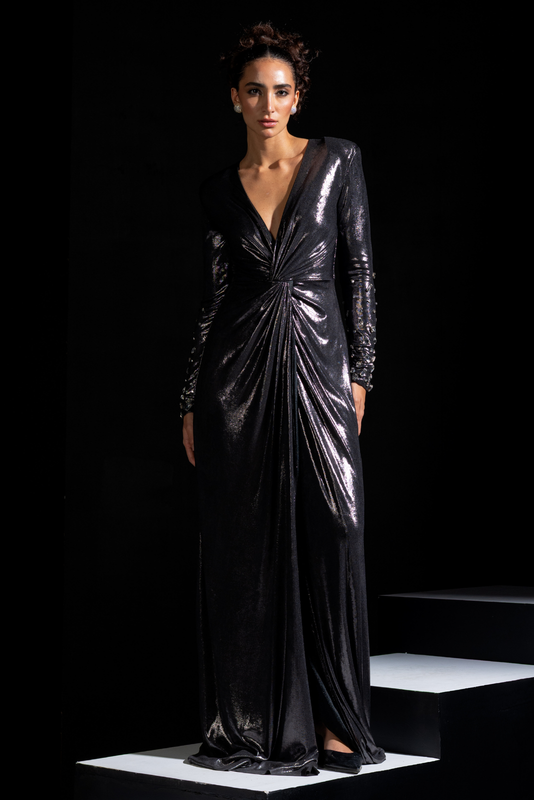 Metallic Grey Full Sleeves Knot Drape Gown - Titan