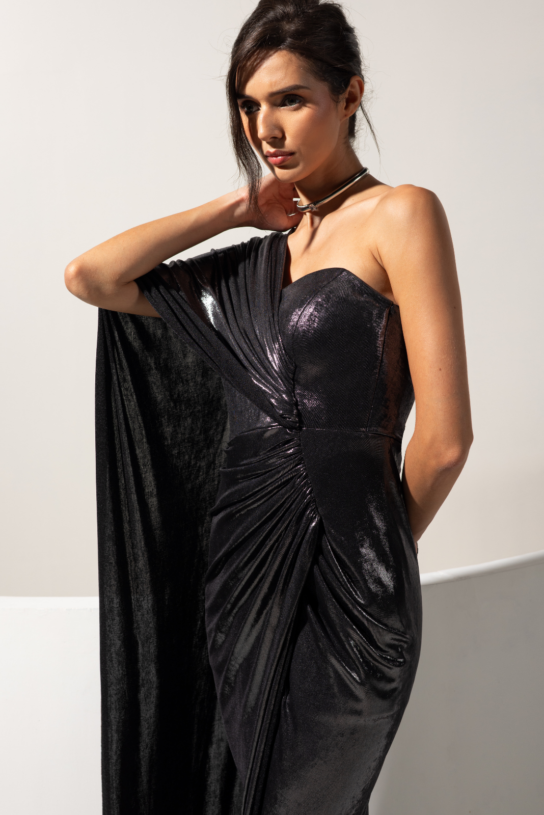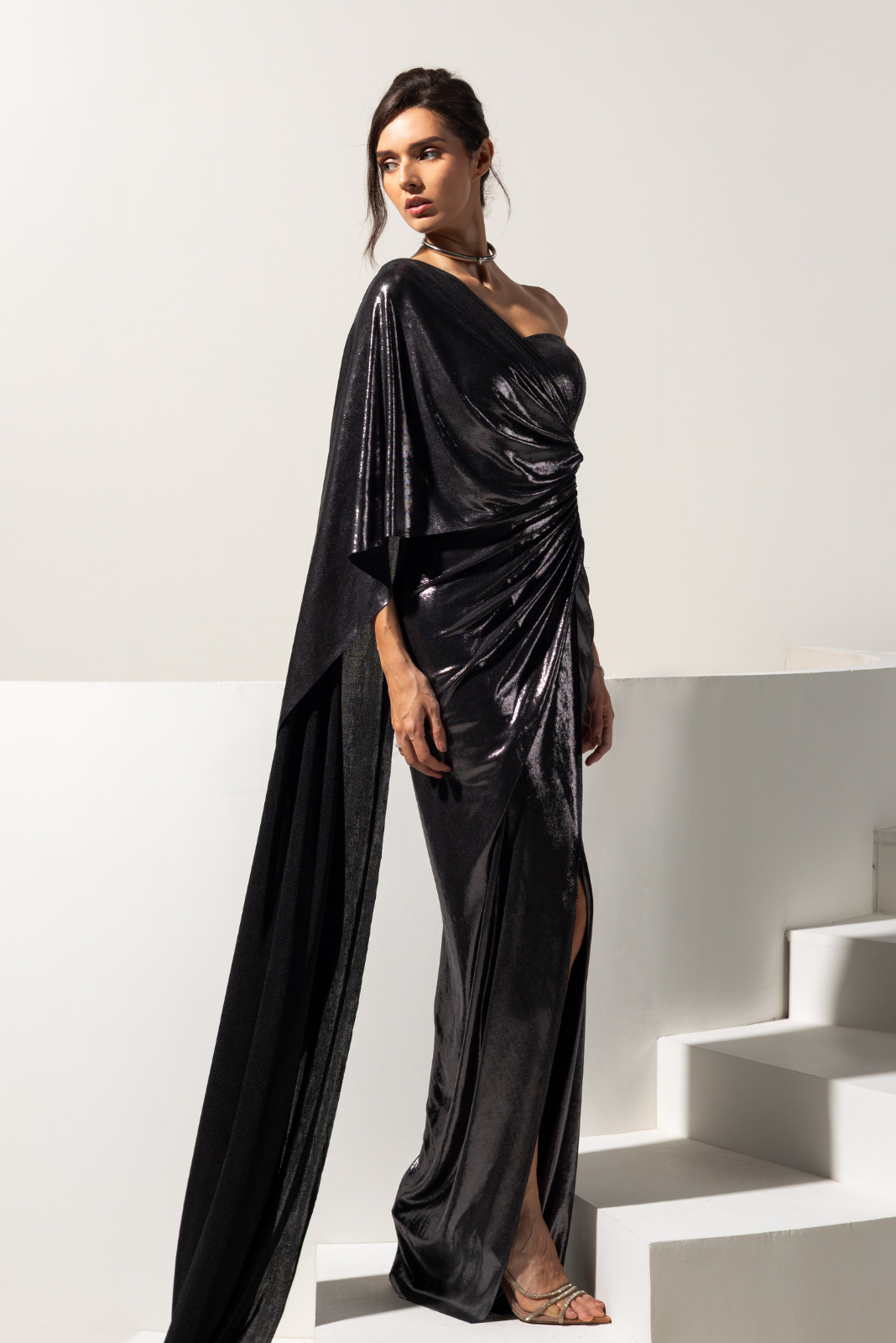 Pre draped one shoulder fully drape gown in metallic fabric