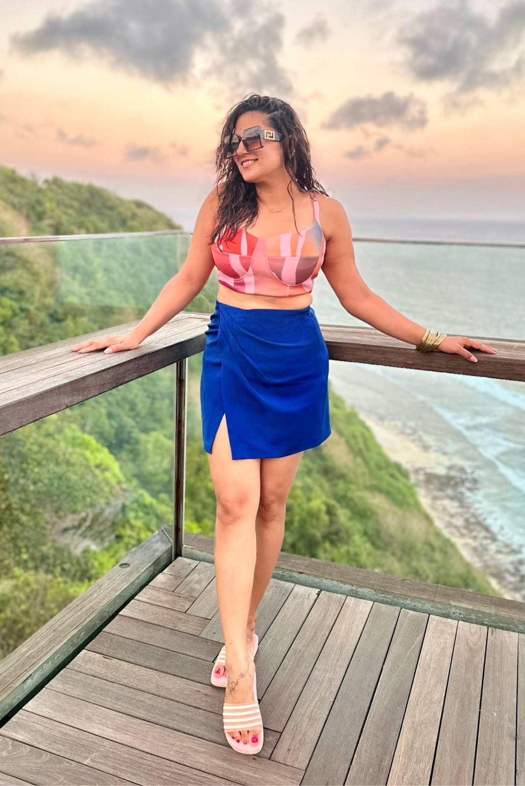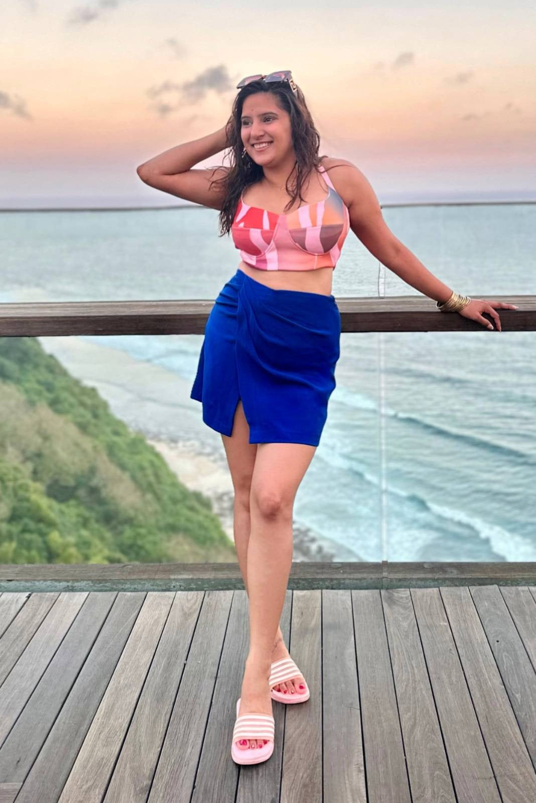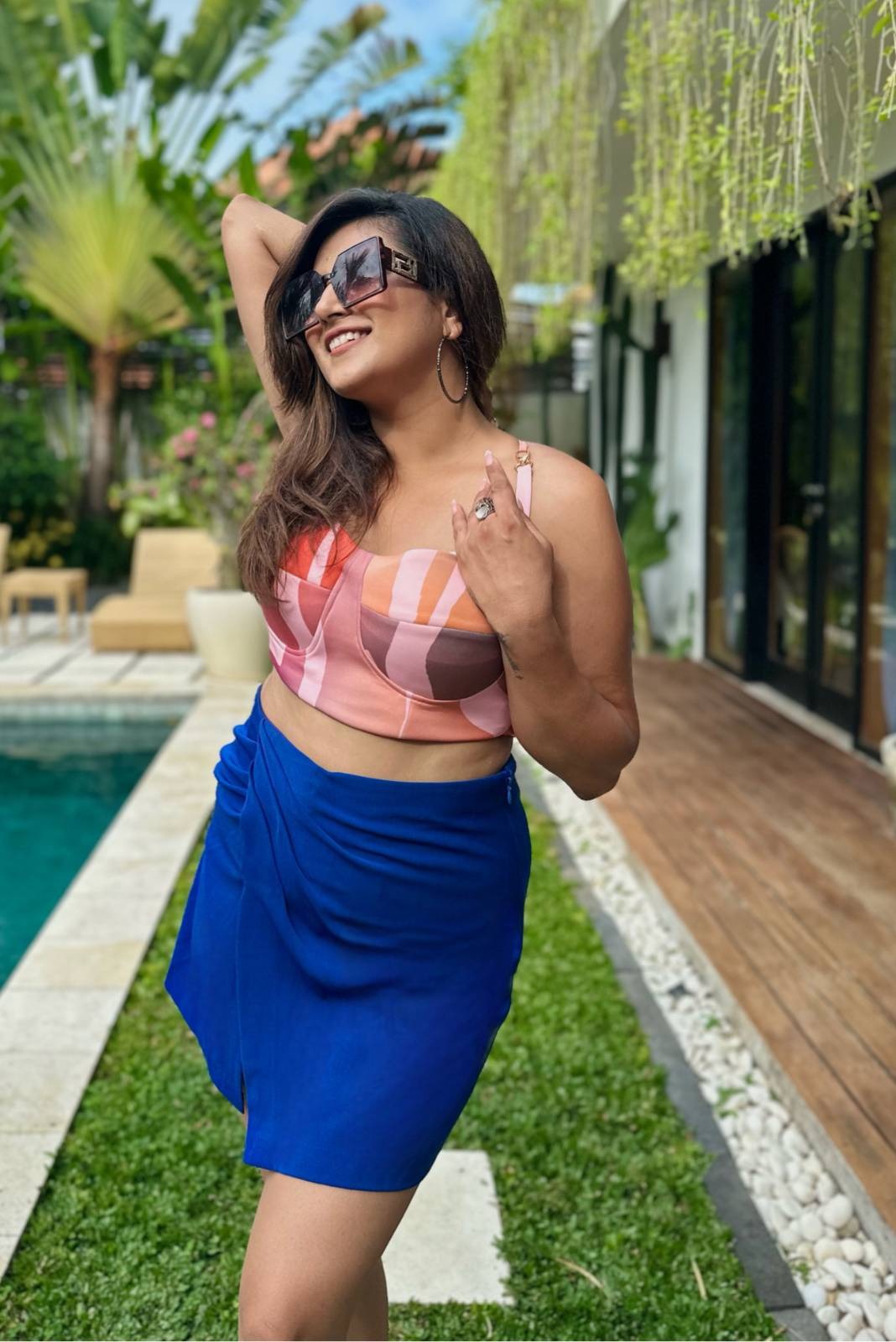 The multicolor stretch corset is so fun and stylish. I appreciate that there's no boning inside, making it comfortable for long hours. The metal detailing on the strap adds a chic accent, and the back metal zip ensures a snug fit. The drape mini skirt with inbuilt shorts is fashionable and practical, providing both style and comfort. I wore this corset to a party and received so many compliments.