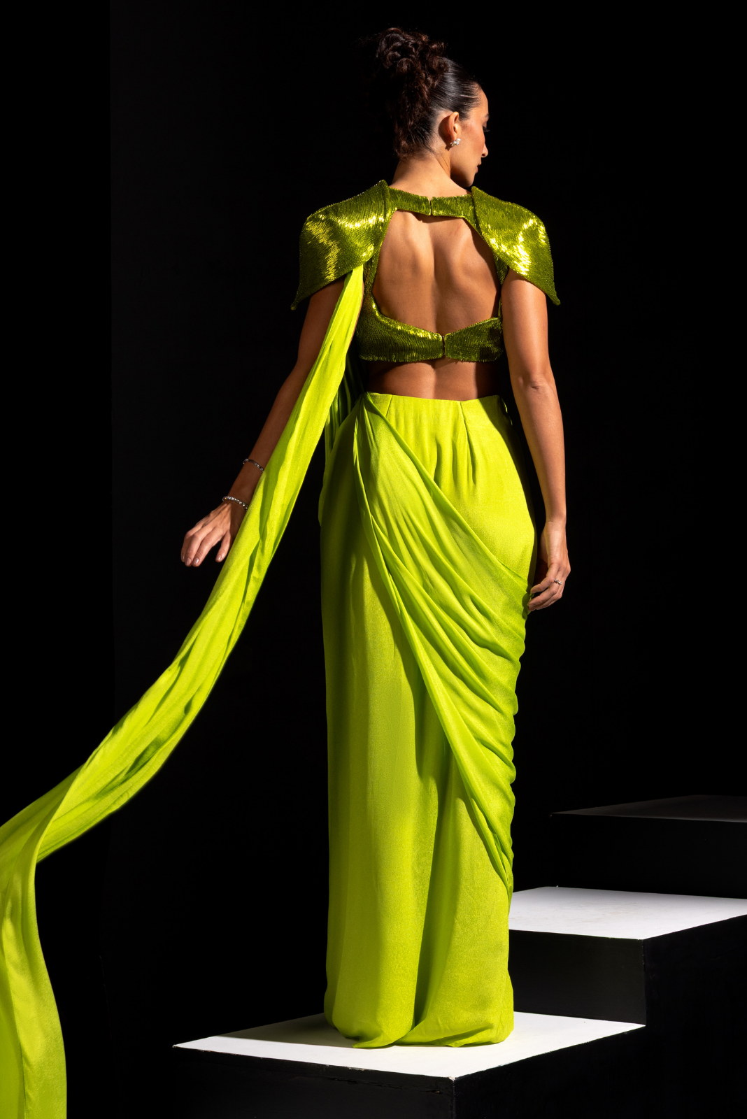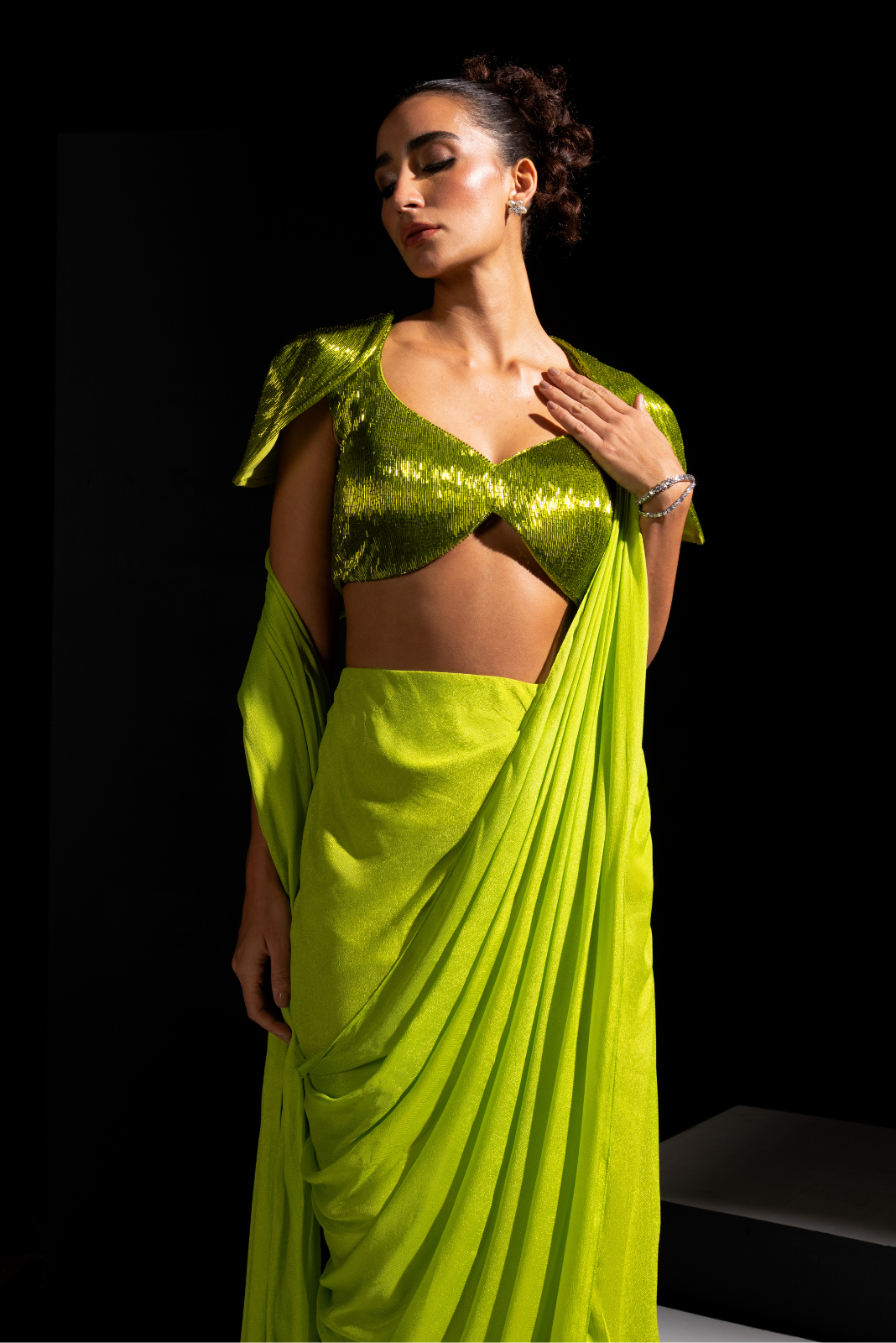 - Neon green fully embroidered blouse with pre-draped saree with a slit
