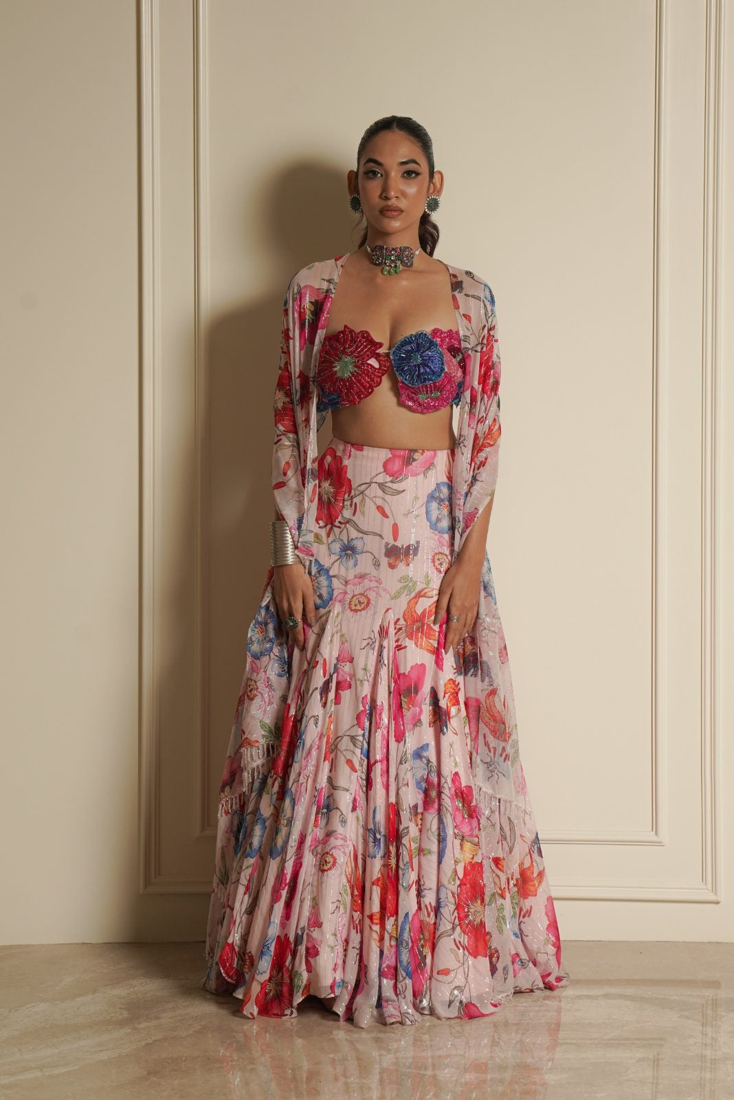 Pink Chiffon Blouse with Printed Fish Cut Lehenga with Dupatta – Wild flower Wonders