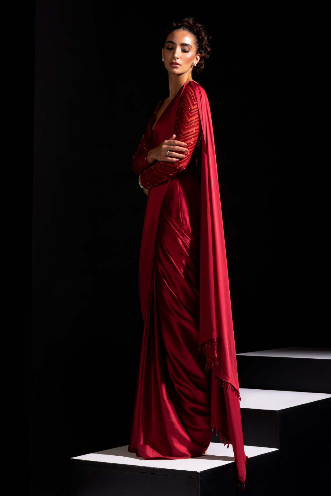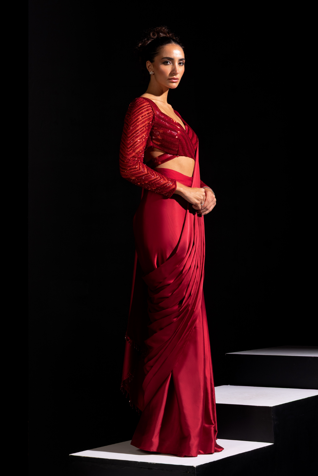 Red Full Sleeves Embroidered Blouse with Ready to Wear Saree - Blaze
