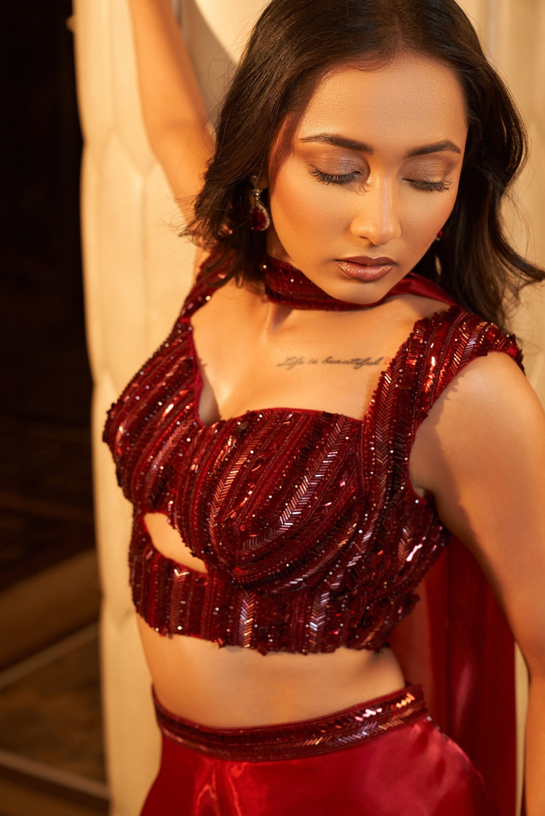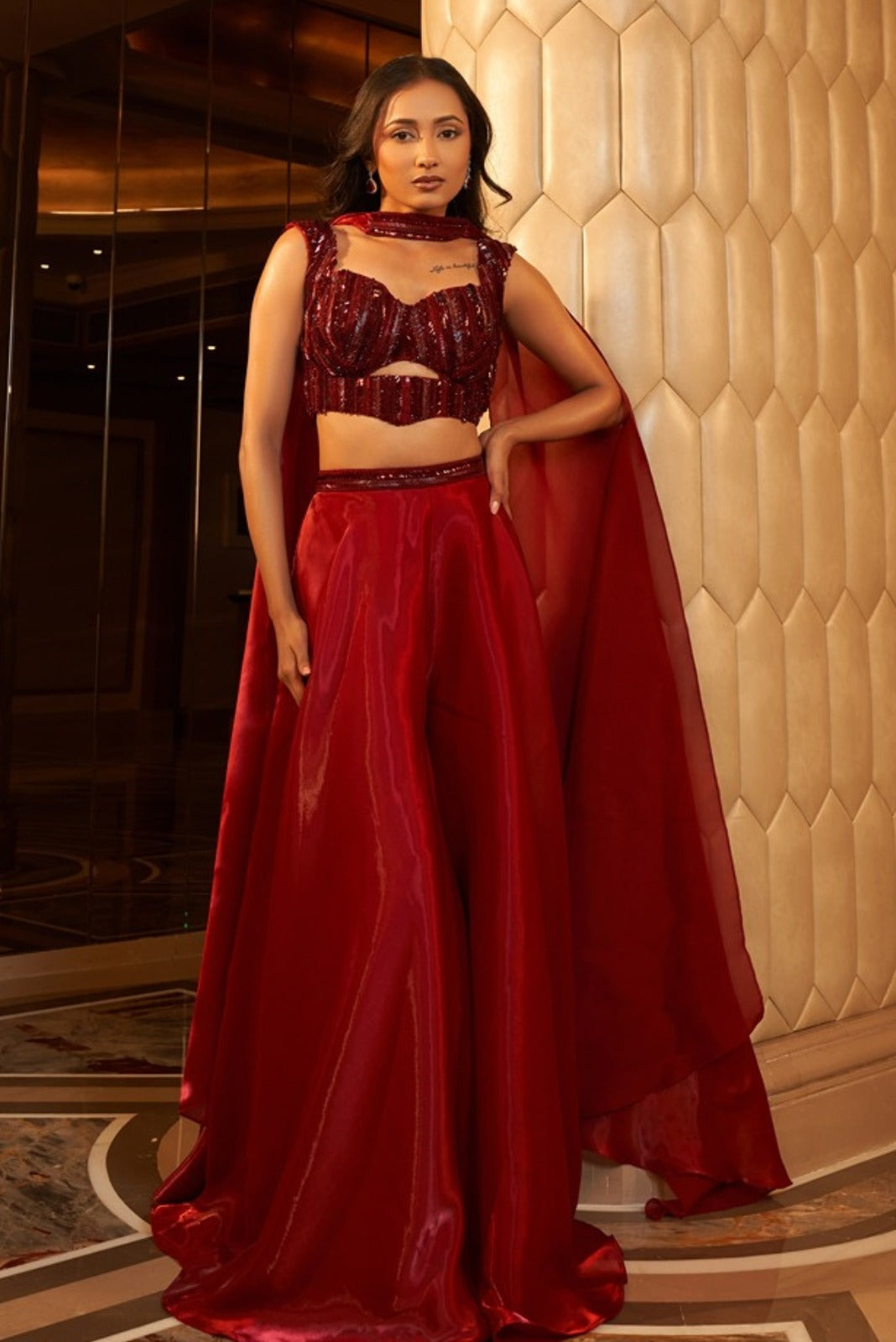 - The intricate adorned blouse with 3d geometric embroidery paired up with full flared palazzo pants for the chic gen-z vibe, which screams comfort and style all at once, Combining these two with yet another easy go to element with a choker dupatta to complete the look.
