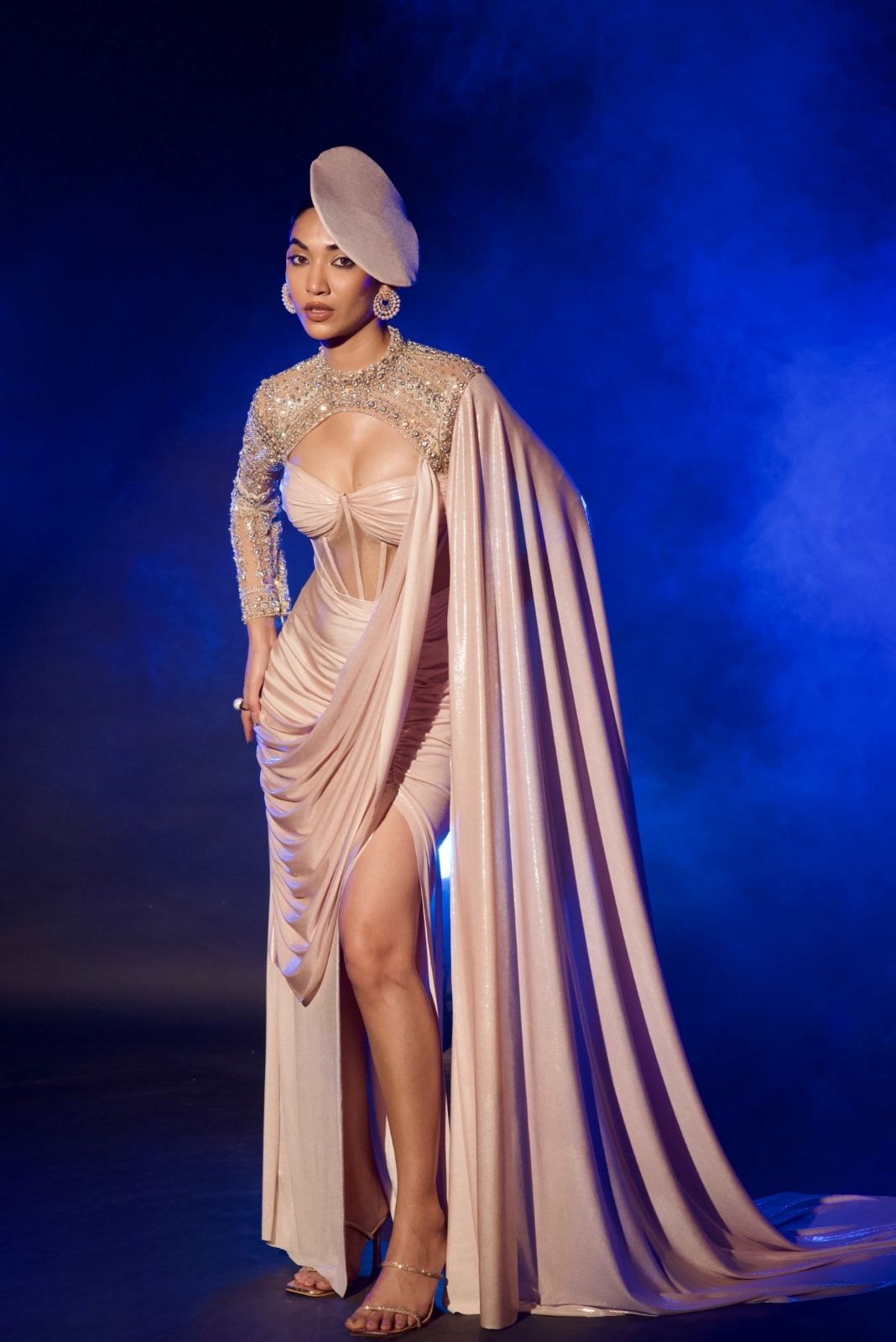 - gown has one side embroidered seeve and on the other it has a cape style sleeves