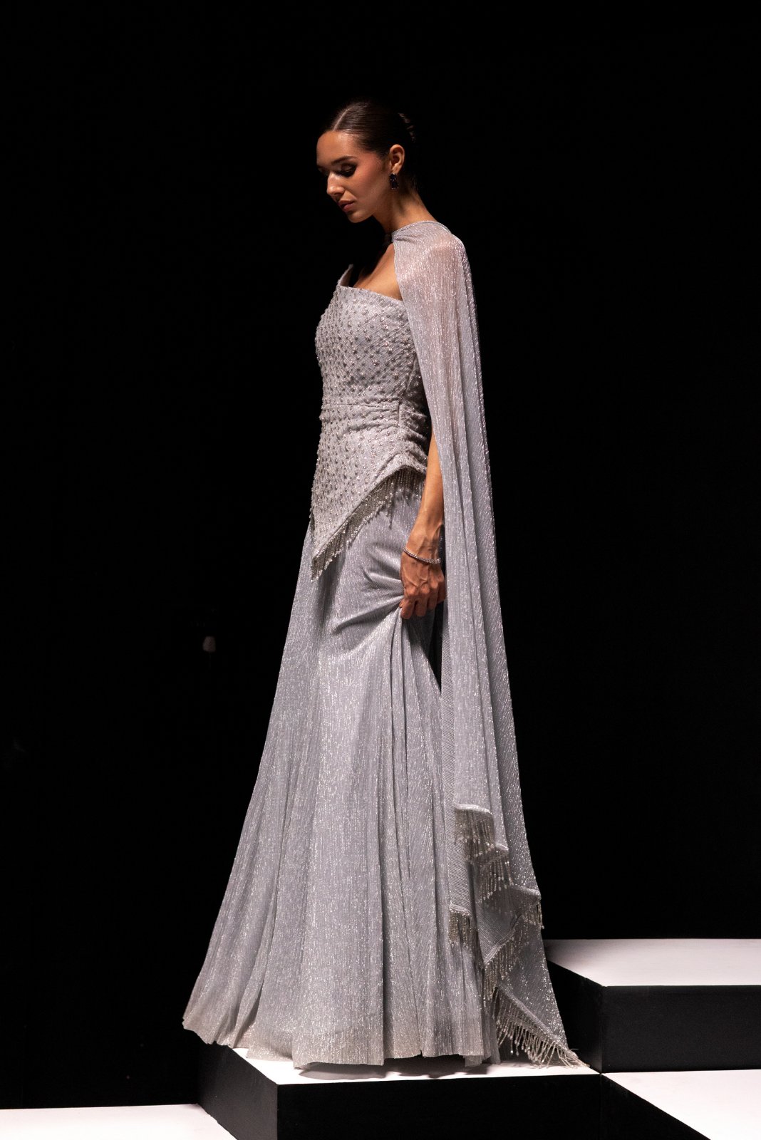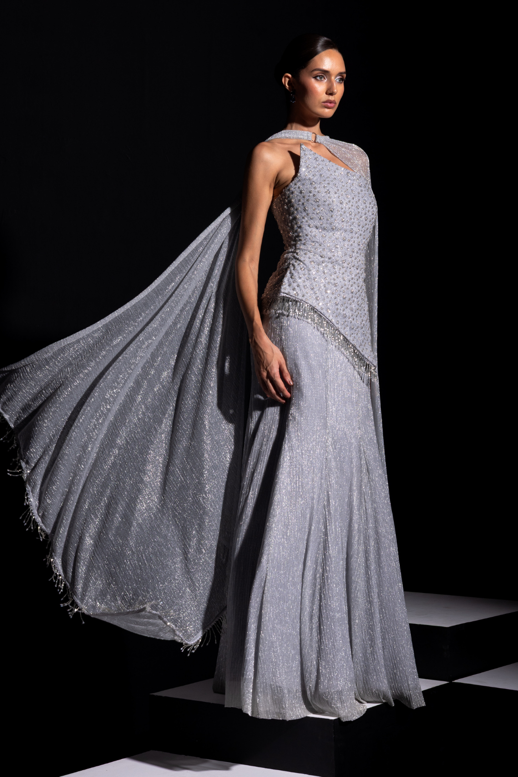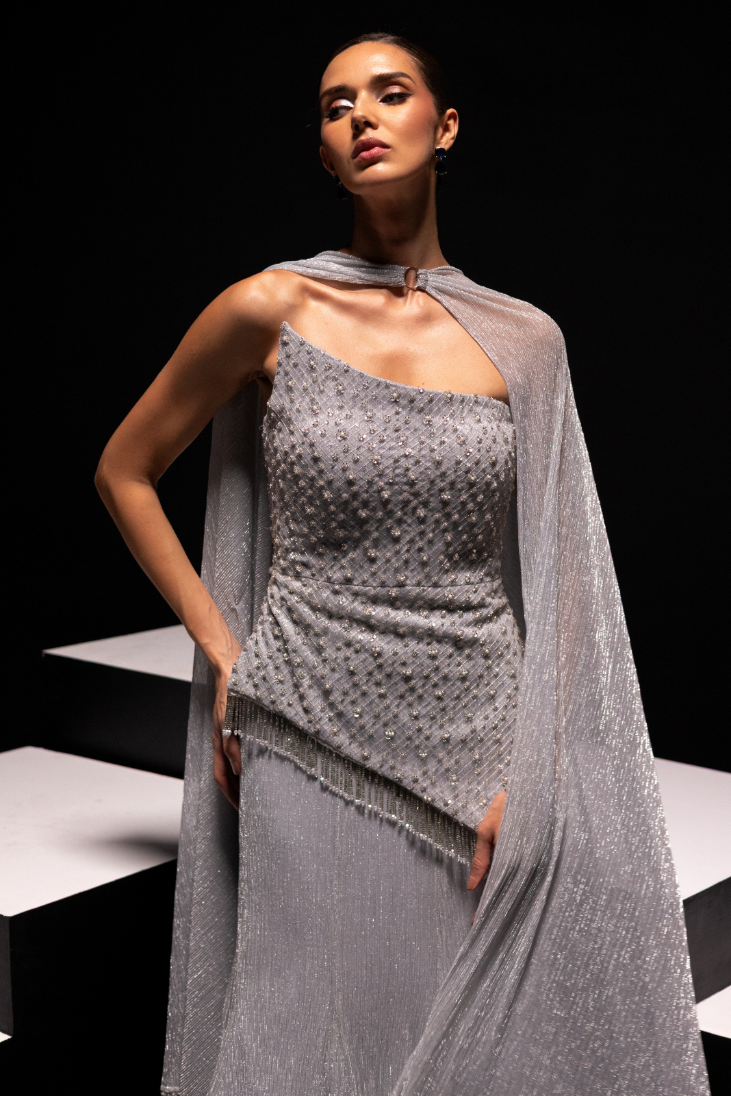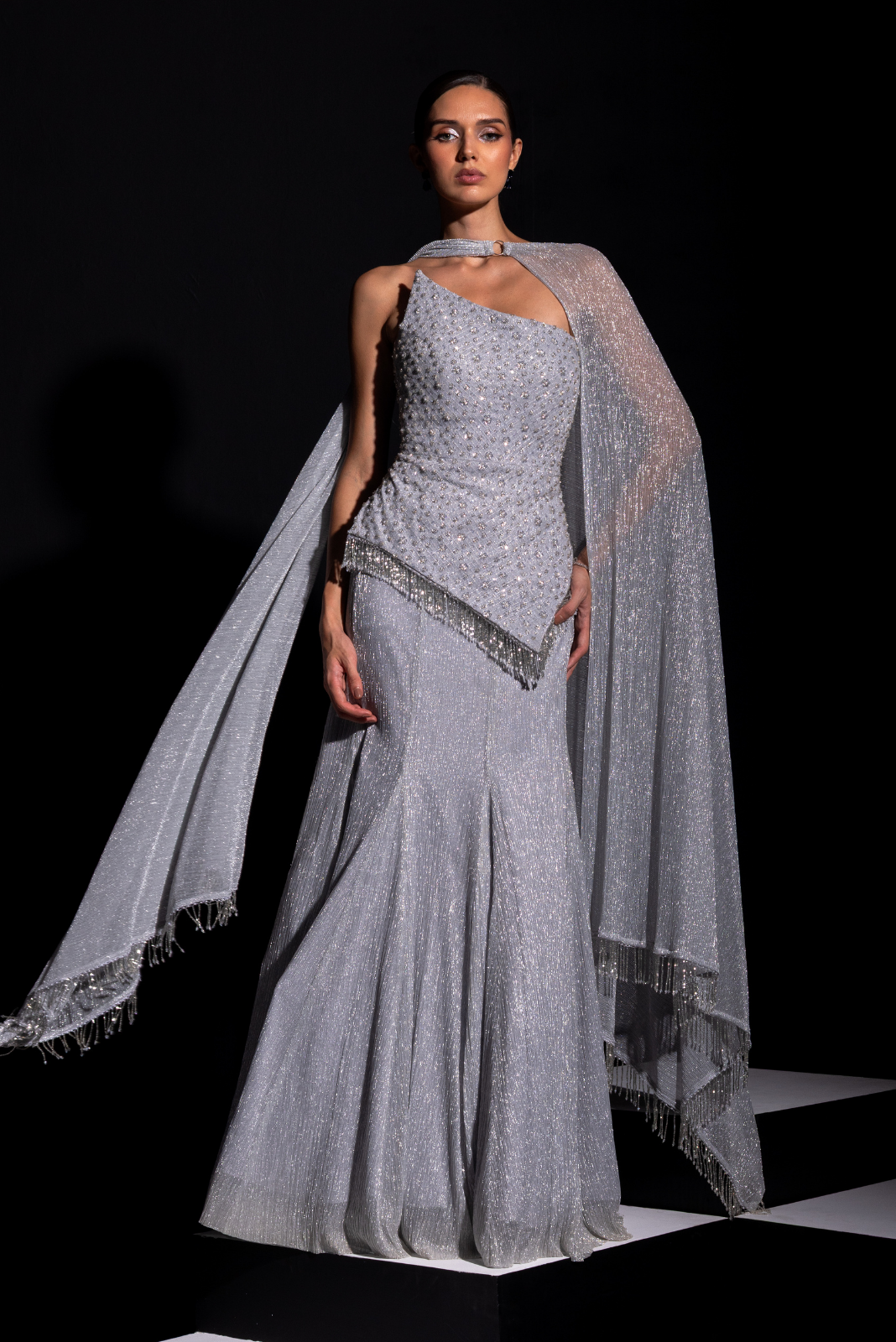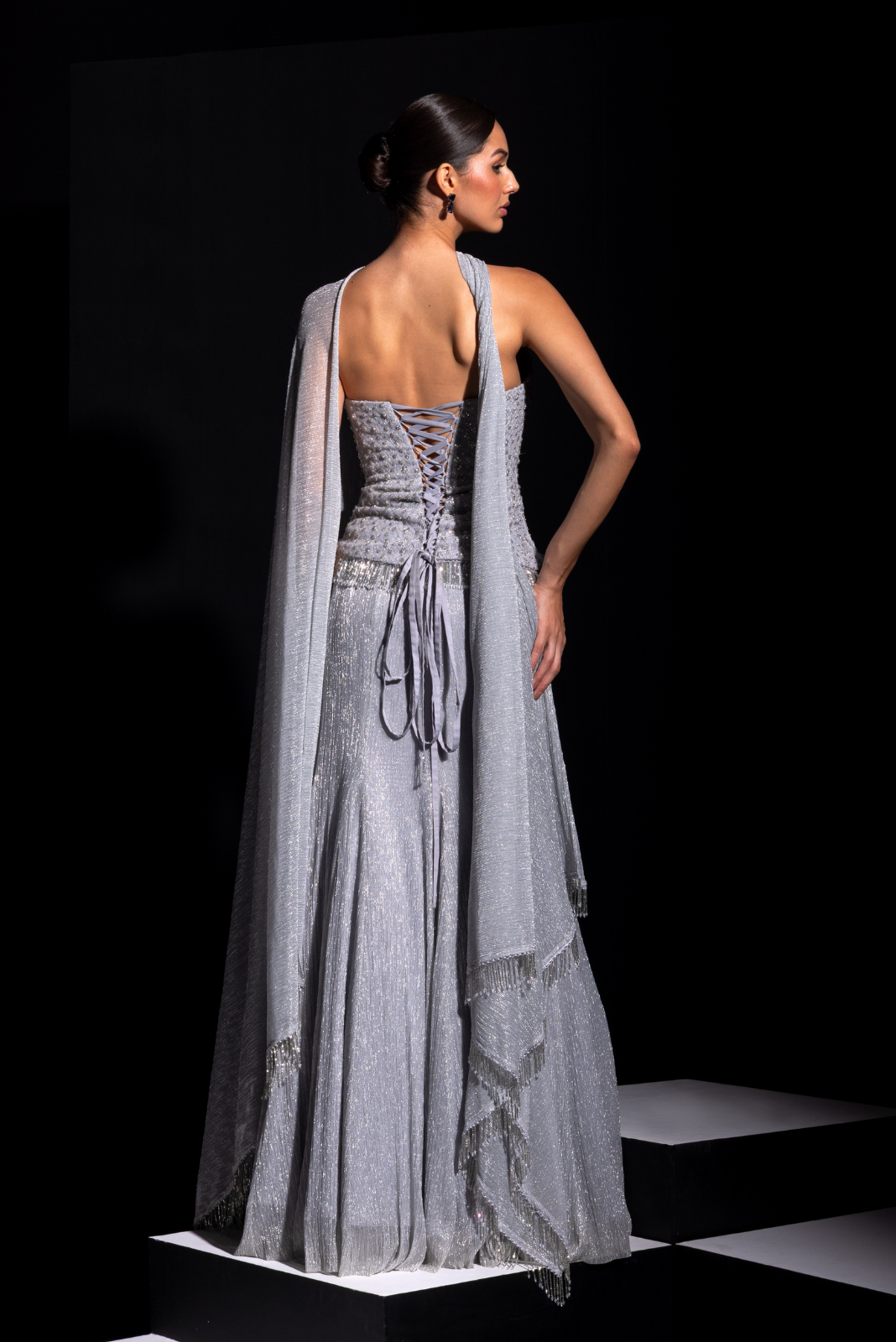 - Beautiful asymmetrical corset paired up with silver metallic skirt with ring choker