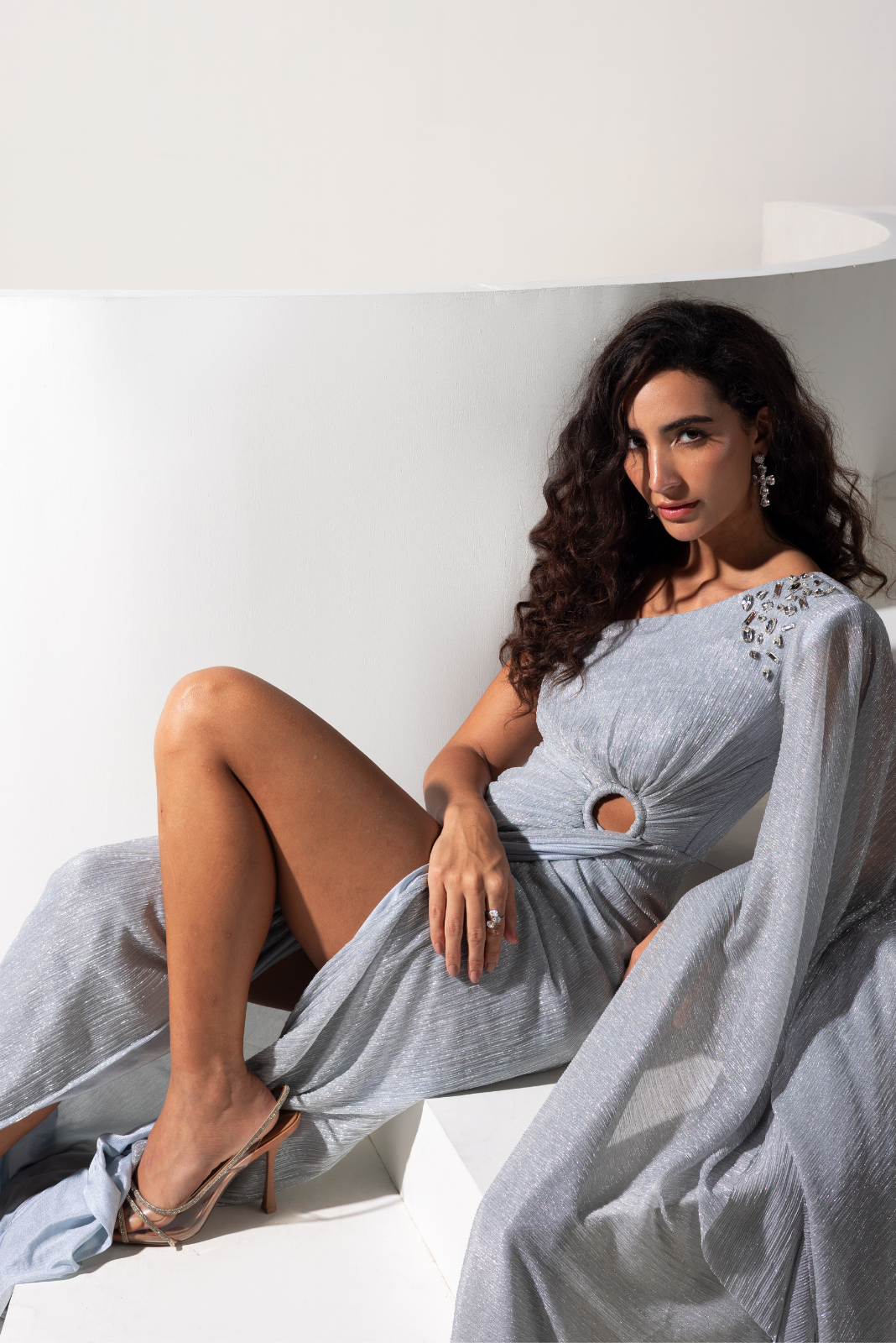 Silver One Shoulder Overlapping Gown with Slit - Lunara